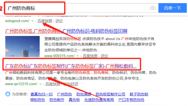 我們公司與廣州傾松數碼科技有限公司合作中,對這個公司所經營的防偽商標這個行業提供了百度快照排名,與該公司的合作,更多的客戶讓我們公司為其提供百度快照排名,通過每一次合作,我們公司不斷完善自己,同時希望合作伙伴在經營的路上越來越好。