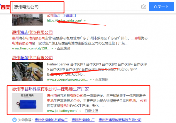 惠州市*邦科技有限公司是一家集研發、生產和銷售于一體的鋰離子電池生產高新技術企業。主要產品為聚合物鋰離子全系列電池。公司擁有多條鋰電池PACK生產線、老化、分容等生產裝備和一大批經驗豐富的產業工人。精湛工藝和科學流程的結合,確保每一個(下線)產品的合格品質。公司興建了大型電池測試中心,先進的電池檢測設備成為“安全電池”的可靠保證,公司產品因此通過了國際國內多家權威機構的認證,成為鋰離子電池模組產品可靠性的優秀代表企業。公司多年來一直奉行“誠信務實、雙贏發展、精益求精、持續改進”為經營宗旨,致力于向客戶提供創新易用、動力強勁、安全可靠的綠色環??沙涠文茉串a品。立足“鋰電池定制”的精確定位,凝聚一批鋰電池行業專家,組建了包括電化學、電子、工藝、結構等多部類、系統化的研發團隊,公司的技術創新能力能夠充分滿足客戶的多樣化、個性化需求?!?br /> 我們公司與惠州市*邦科技有限公司合作中,對這個公司所經營的電池這個行業提供了百度快照排名,與該公司的合作,更多的客戶讓我們公司為其提供百度快照排名,通過每一次合作,我們公司不斷完善自己,同時希望合作伙伴在經營的路上越來越好。