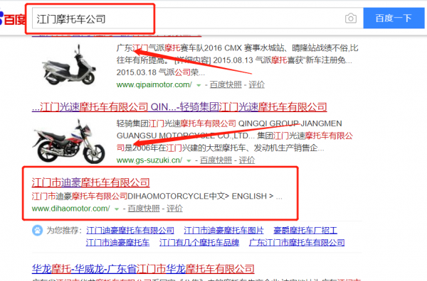 江門市迪豪摩托車有限公司選用我司企業摩托車的網站優化產品,其SEO關鍵詞有摩托車。從站內到站外,人工智能全新搜索優化技術,最快7天關鍵詞排名上首頁,利用互聯網營銷手法,多平臺,多樣化進行品牌內容鋪設,營造企業正面形象。江門市迪豪摩托車有限公司成立于1998年,是經江門市市場監督管理局審核的有資質的公司,其統一社會信用代碼:91440703712223018G。公司地址: 廣東省江門市蓬江區宏達工業區建達北路7號。