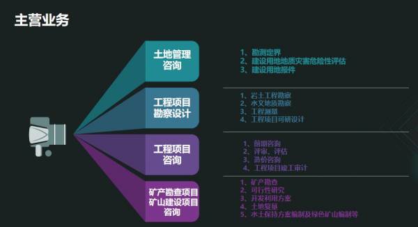 盈合咨詢公司業務領域覆蓋了工程建設項目的立項申報、可行性研究、建設項目前期用地土地報批、環評、安評、地質災害評估、水土保持、國土測繪、巖土工程勘察、設計、評估咨詢及結算審計等工程全過程管理咨詢業務;礦業企業探礦權申報、勘查、評估及采礦權報審的全過程咨詢業務。