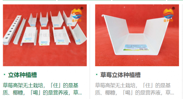 石家莊科環種植設備有限公司,成立于2001年,位于河北省石家莊市藁城區北孟工業區。主營業務有:生產加工立體種植槽,草莓種植槽,水培種植槽,瓜果蔬菜種植槽及各種配件設施等。產品用于農業觀光園、生態式種植、無土式種植、能為種植:草莓、蔬菜、花生、金針菇等提供優質的產品。種植立體草莓槽可用于多種形式的種植,立體高架式、懸掛種植式、平放于地面種植式。立體種植槽可用于無土立體栽培種植,槽內可放置基質肥或營養液。公司秉承“保證產品質量,保持公司信譽”的經營理念,堅持“客戶至上”的原則為廣大客戶提供優質的服務。歡迎來電洽談業務!