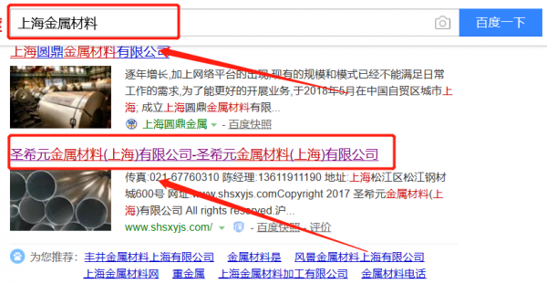 圣希元金屬材料(上海)有限公司選用我司企業金屬材料的網站優化產品,其SEO關鍵詞有金屬材料。快速優化系統火速推采用智能數據系統,效果一目了然,包括關鍵詞排名,消費,余額等,并通過大量的數據分析優化廣告效果。圣希元金屬材料(上海)有限公司成立于2010年,是經上海市市場監督管理局審核的有資質的公司,其統一社會信用代碼:9131011756312877X2。公司地址:上海市松江區永豐街道玉樹路269號5號樓33105室。