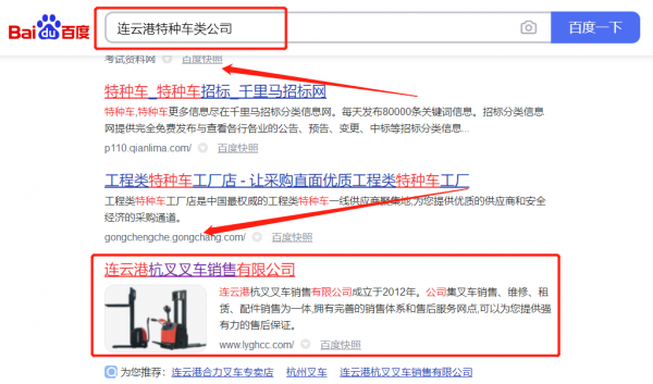 我們公司與連云港杭*叉車銷售有限公司合作中,對這個公司所經(jīng)營的特種車類這個行業(yè)提供了網(wǎng)站SEO優(yōu)化,與該公司的合作,更多的客戶讓我們公司為其提供百度快照排名,通過每一次合作,我們公司不斷完善自己,同時希望合作伙伴在經(jīng)營的路上越來越好。