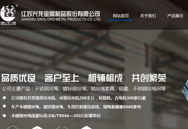 江蘇興龍金屬制品股份有限公司地處于“中國不銹鋼名鎮”——江蘇省興化市戴南鎮,創立于1985年,一直從事各類鋼絲繩及鋼絲繩制品的研制、生產與銷售。現有員工420人.工廠占地面積86500平方米。公司擁有各型高速拉絲機、水箱拉絲機200余臺,捻股機、合繩機300多臺套。年產不銹鋼絲繩、鍍鋅鋼絲繩、車用控制索拉筋線、鋼繩索具等6600多噸。廣泛應用于港口碼頭、建筑裝璜、農林石化、漁業、汽車、醫療器械等行業是國內規模較大、品種較全的不銹鋼絲繩及鋼絲繩索具生產基地。002年取得自營出口權資格,產品70%出口海外,遠銷美國、英國、意大利、德國、日本、韓國、西班牙、澳大利亞、南非、印度等國家。