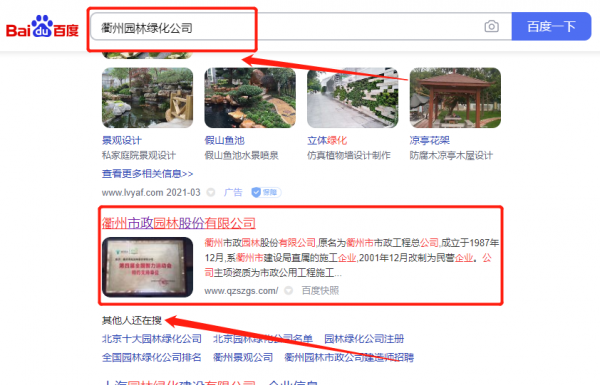 衢州市*園林股份有限公司選用我司企業園林綠化的網站優化產品,其SEO關鍵詞有園林綠化。3-15天快速提升網站前五頁關鍵詞排名上百度首頁,幫助客戶增加流量,提高成交量,為您帶來更多潛在客戶,打造客戶品牌影響力。衢州市*園林股份有限公司成立于1987年,是經衢州市市場監督管理局審核的有資質的公司,其統一社會信用代碼:91330800**9808544L。公司地址:浙江省衢州市區西安路156號。