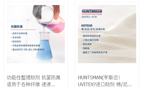 紹興市久*化工有限公司系美國亨斯邁一級代理,臺灣永光、日本住友、科萊恩、魯道夫、禾大公司、邁圖有機硅有限公司、日本旭硝子、上海萬得、上海十廠、青島雙桃等國內知名廠家的銷售點,價格優惠,歡迎面洽,并提供技術咨詢。 主營:中高檔活性染料、分散染料、酸性染料、中性染料、還原染料、直接染料、進口助劑、助劑原材料。同時供應防水、防污、抗菌、抗皺、抗紫外線、吸濕排汗、超級柔軟等功能性整理助劑. 2012年新品:超高牢度分散染料SFN+EL-SF超級穩定劑,帶給您的是更簡單、更穩定、更高效的染色整體解決方案。 希望我們提供的高品質染料助劑,優良的服務,能帶給您更絢麗的色彩,使您的企業更加燦爛輝煌!
