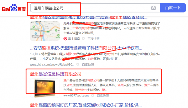 我們公司與溫州*谷信息科技有限公司合作中,對(duì)這個(gè)公司所經(jīng)營的車輛監(jiān)控這個(gè)行業(yè)提供了網(wǎng)站推廣,與該公司的合作,更多的客戶讓我們公司為其提供百度快照排名,通過每一次合作,我們公司不斷完善自己,同時(shí)希望合作伙伴在經(jīng)營的路上越來越好。