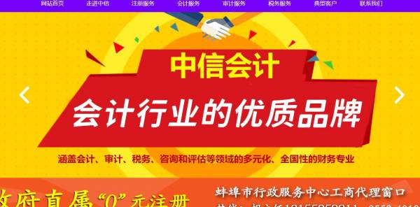 蚌埠中*會計服務有限公司選用我司企業會計服務行業的網站優化產品,其SEO關鍵詞有 蚌埠中*會計服務有限公司,蚌埠公司注冊,蚌埠注冊公司,蚌埠代賬公司,蚌埠代賬會計。其特點是用很合適的展示方式、展示效果、站點框架,把客戶及其用戶很關心的問題突出表現;并以簡潔明朗的設計風格,清晰展現公司水平實力,確保一秒抓住目標用戶眼球,給用戶留下良好的第一印象。蚌埠中*會計服務有限公司成立于2010年,是經蚌埠市市場監督管理局審核的有資質的公司,其統一社會信用代碼:91340300***82548X2。公司地址:安徽省蚌埠市體育路名仕公館1501--1503號(老二中南門往東30米)。