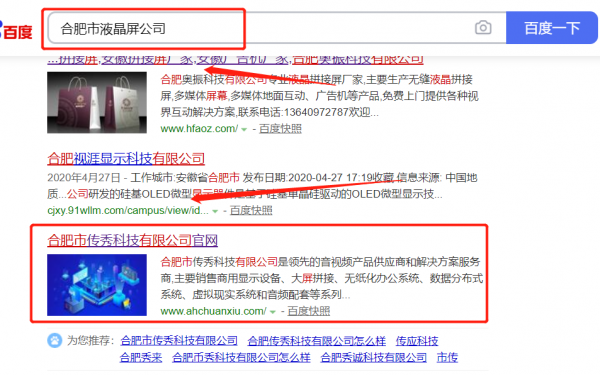 我們公司與合肥市*秀科技有限公司合作中,對這個公司所經營的液晶屏這個行業提供了網絡營銷,與該公司的合作,更多的客戶讓我們公司為其提供快速排名,通過每一次合作,我們公司不斷完善自己,同時希望合作伙伴在經營的路上越來越好。