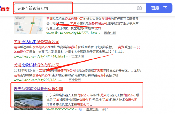 埃夫*智能裝備股份有限公司選用我司企業車管設備行業的網站優化產品,其SEO關鍵詞有車管設備。分析目標客戶不同的搜索習慣,為企業官網定制關鍵詞并推廣到搜索引擎首頁,全面鎖定每一個目標客戶,使客戶瞬間找到你。埃夫*智能裝備股份有限公司成立于2007年,是經蕪湖市市場監督管理局審核的有資質的公司,其統一社會信用代碼:9134020**64238230M。公司地址:安徽省蕪湖市鳩江經濟開發區萬春東路96號。