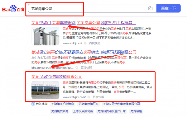 蕪湖漢*特種集裝箱有限公司選用我司企業崗亭的網站優化產品,其SEO關鍵詞有崗亭。專家1對1的定制解決方案,篩選的關鍵字40-60天就能排名上去。若沒有達到效果,除服務費全部退還,讓企業無后顧之憂。蕪湖漢*特種集裝箱有限公司成立于2017年,是經蕪湖市市場監督管理局審核的有資質的公司,其統一社會信用代碼:91340221M**Q3EEN6J。公司地址:安徽省蕪湖市新蕪經濟開發區科創二路二號。