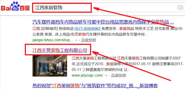 我們公司與江西天譽裝飾工程有限公司合作中,對這個公司所經營的家居軟飾這個行業提供了百度快照排名,與該公司的合作,更多的客戶讓我們公司為其提供百度快照排名,通過每一次合作,我們公司不斷完善自己,同時希望合作伙伴在經營的路上越來越好。