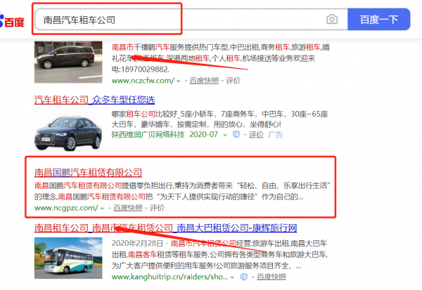 南昌*鵬汽車租賃有限公司選用我司企業汽車租車行業的網站優化產品,其SEO關鍵詞有汽車租車。通過對搜索引擎目標關鍵詞優化,使目標網站的相關信息顯示在百度首頁,為企業挖掘更多的潛在客戶的同時帶來海量的商機。南昌*鵬汽車租賃有限公司成立于2015年,是經南昌市市場監督管理局審核的有資質的公司,其統一社會信用代碼:91360104**2140357M。公司地址:江西省南昌市青云譜區洪城路8號2幢B座1606室。