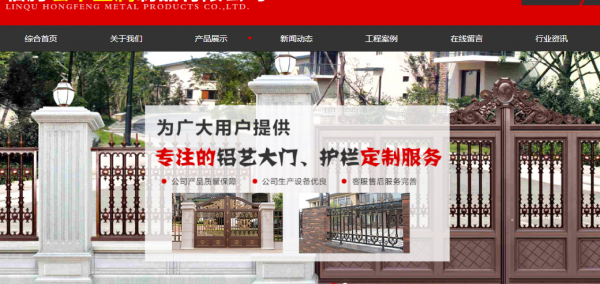 臨朐宏*金屬制品有限公司選用我司企業金屬制品行業的網站優化產品,其SEO關鍵詞有 臨朐鋁藝護欄,臨朐鋁藝大門,臨朐宏*金屬制品有限公司。其特點是用很合適的展示方式、展示效果、站點框架,把客戶及其用戶很關心的問題突出表現;并以簡潔明朗的設計風格,清晰展現公司水平實力,確保一秒抓住目標用戶眼球,給用戶留下良好的第一印象。臨朐宏*金屬制品有限公司成立于2018年,是經臨朐市市場監督管理局審核的有資質的公司,其統一社會信用代碼:91370724M**MN1JD8B。公司地址:山東省濰坊市臨朐縣寺頭鎮洛莊村。