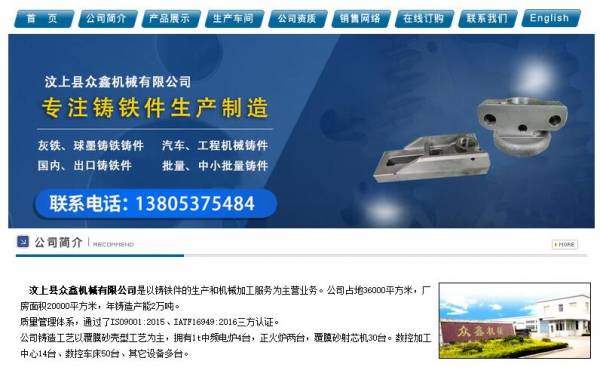 汶上縣眾*機械有限公司是以鑄鐵件的生產和加工為主的私營企業(主要生產灰鑄鐵、球墨鑄鐵),公司擁有進出口自營權。公司占地3.6萬平方米,廠房面積2萬平方米,年鑄造能力1.2萬噸。2006年通過ISO9000質量管理體系認證;2013年通過TS16949質量管理體系認證。